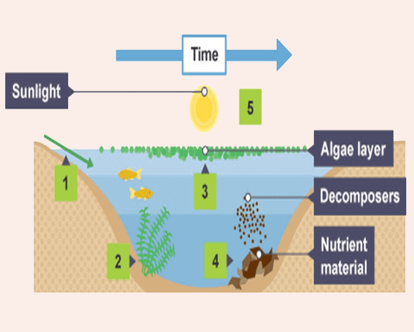 Eutrophication encourages the growth of algae. These form a green bloom over the water surface, preventing sunlight reaching other water plants. These plants die because they are unable to carry out photosynthesis.