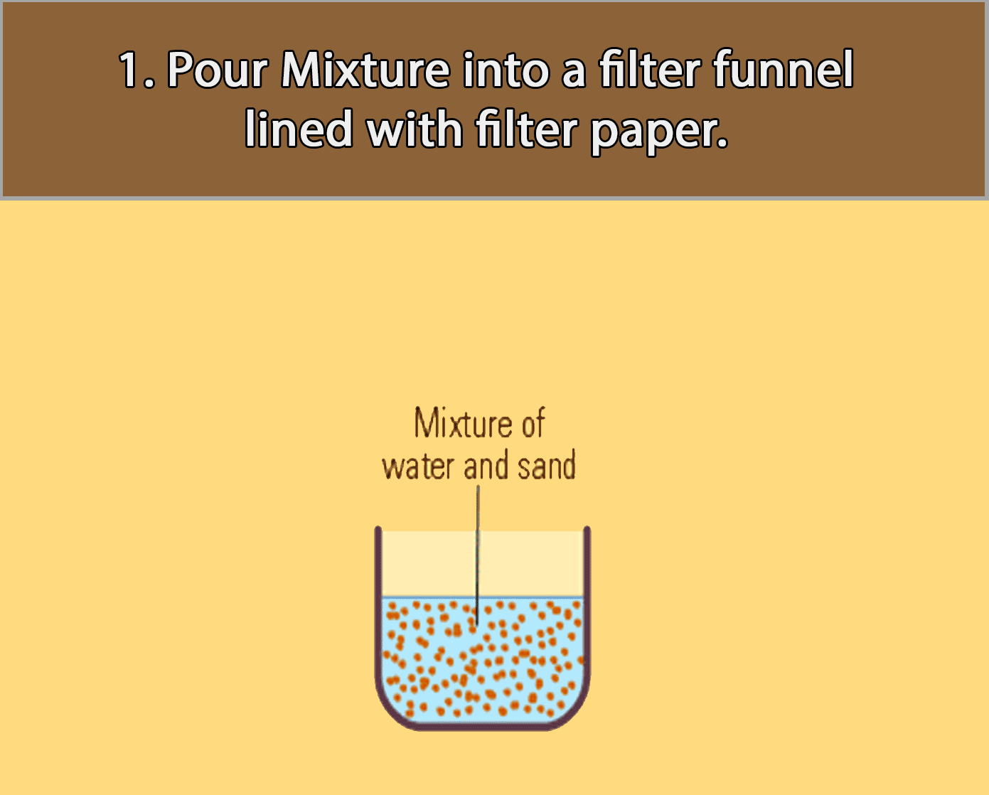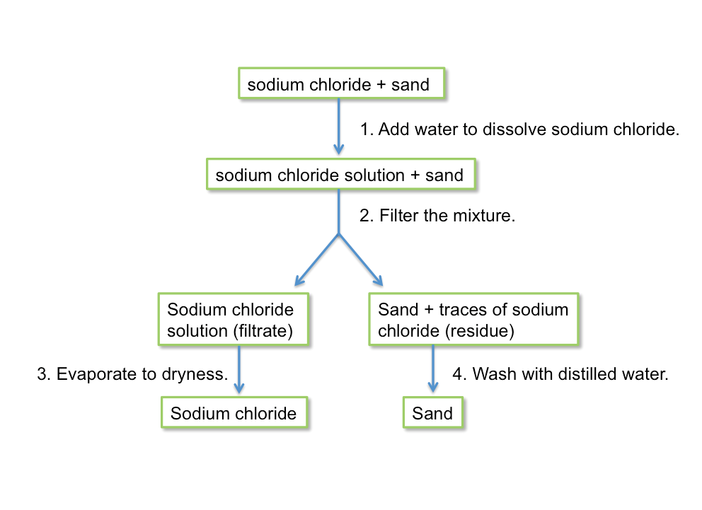 For example, sand can be separated from a mixture of sand and water by filtration. The residue can be collected by drying on a piece of filter paper, while the filtrate can be collected in the conical flask.
