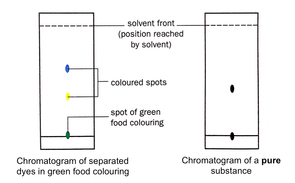 The resulting chromatogram of the experiment above shows that the green food colouring is a mixture of two dyes. On the other hand, a pure substance is made up of only one dye and gives only one spot on a chromatogram.