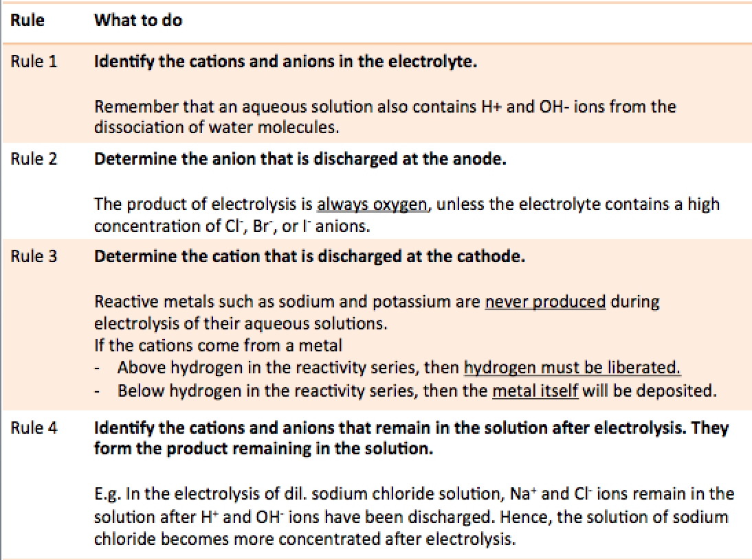 The following rules can be applied when predicting the products of electrolysis of any aqueous solution (using inert electrodes):