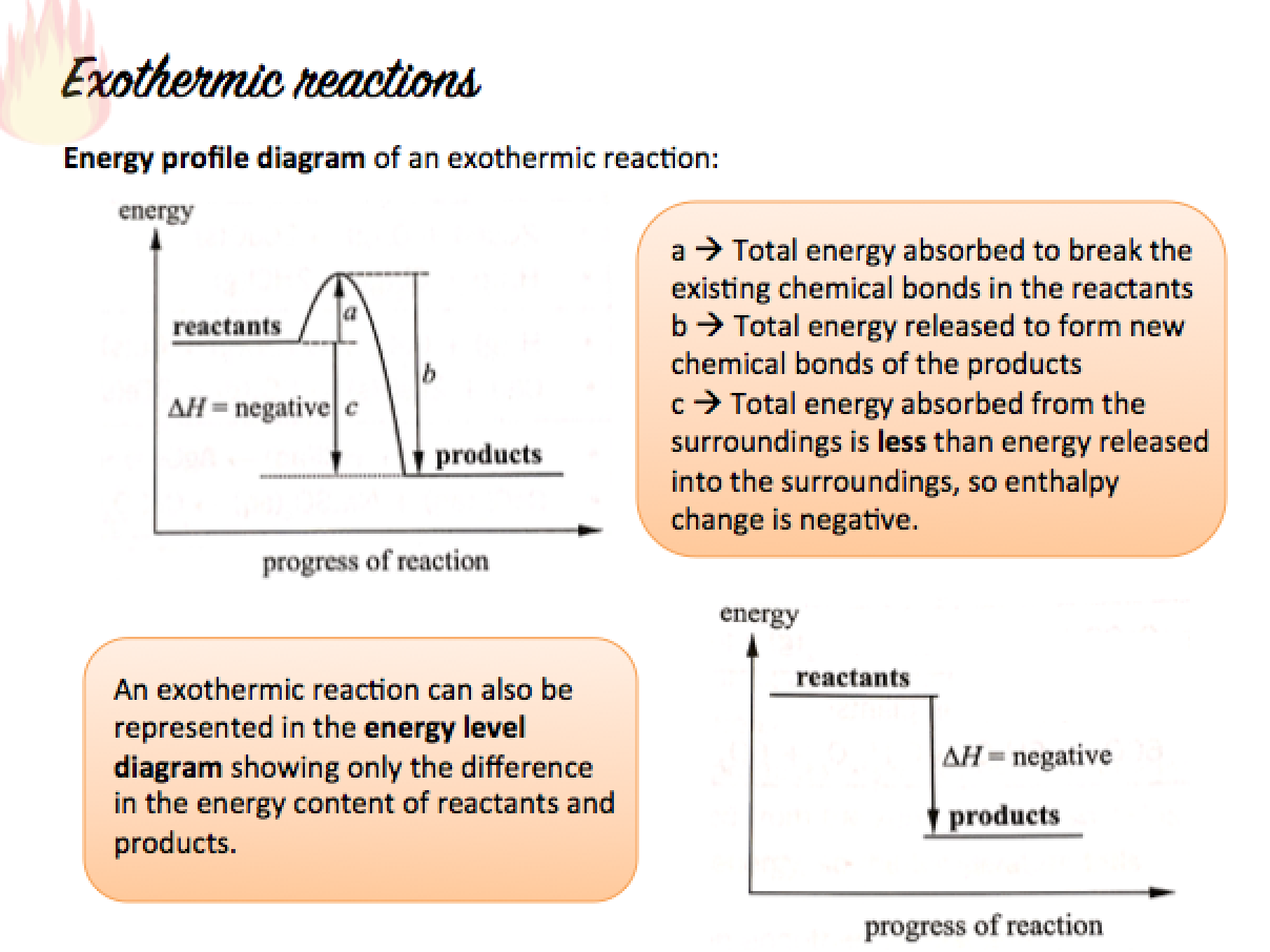In an exothermic reaction, the energy taken in during bond-breaking is less than the energy released during bond-formation. Hence, in an exothermic reaction: