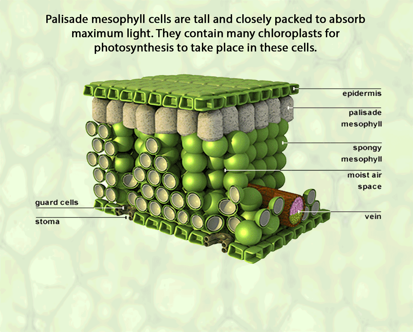 Palisade mesophyll cells lie in the upper layer of mesophyll where most photosynthesis takes place.