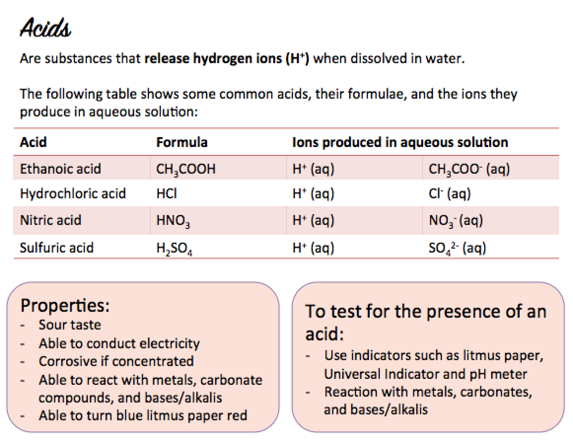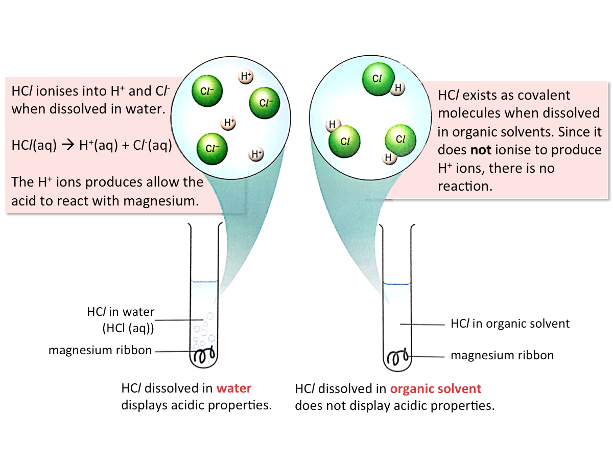 Acids only display their properties when dissolved in water, as they only produce hydrogen ions (H+) in water. The hydrogen ions give acids their acidic properties.
