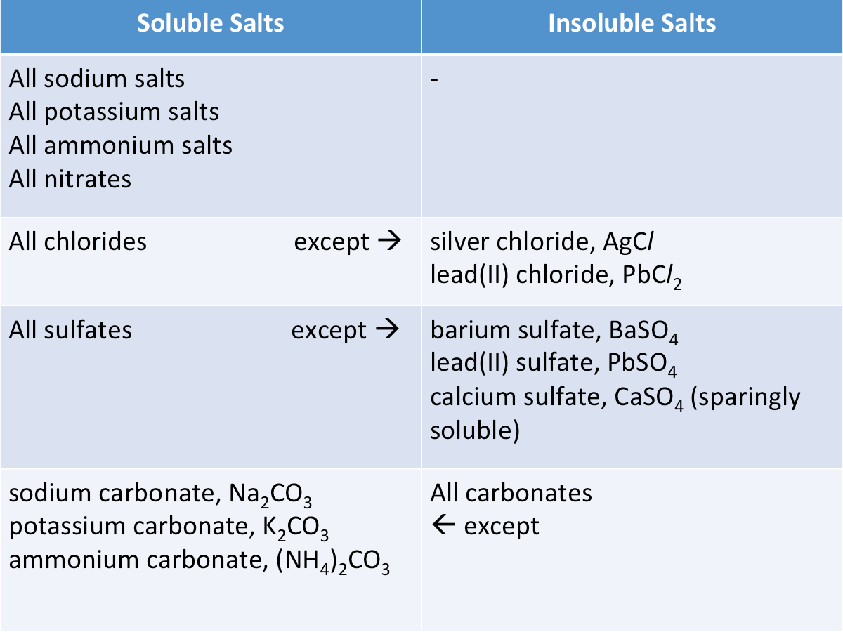 There are several ways to make salts. Two factors must be considered before deciding on how to prepare a salt: