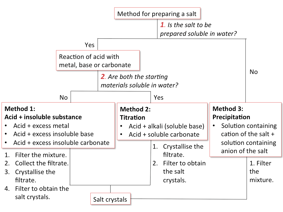 2. Solubility of the starting materialsIf the salt is soluble, it is usually prepared from the reaction with acids. If the salt is insoluble, it is usually prepared by the precipitation method.