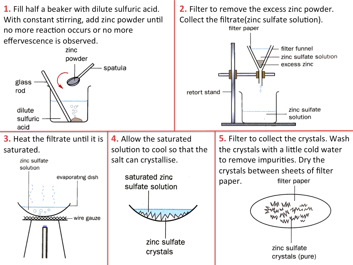 The figure below shows how zinc sulfate is prepared from the reaction of an acid with a metal.