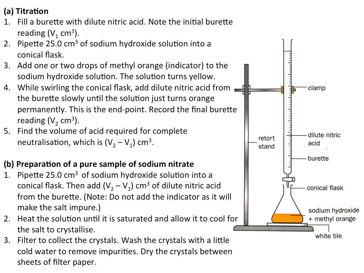 In this method, all the starting materials are soluble. They cannot be in excess as they cannot be removed from the salt solution by filtration and will cause the salt produced to be impure. Hence, the volume of each starting material used must be exact. Sodium, potassium and ammonium salts can be prepared using the titration method. The figure below shows how sodium nitrate can be prepared by titration.