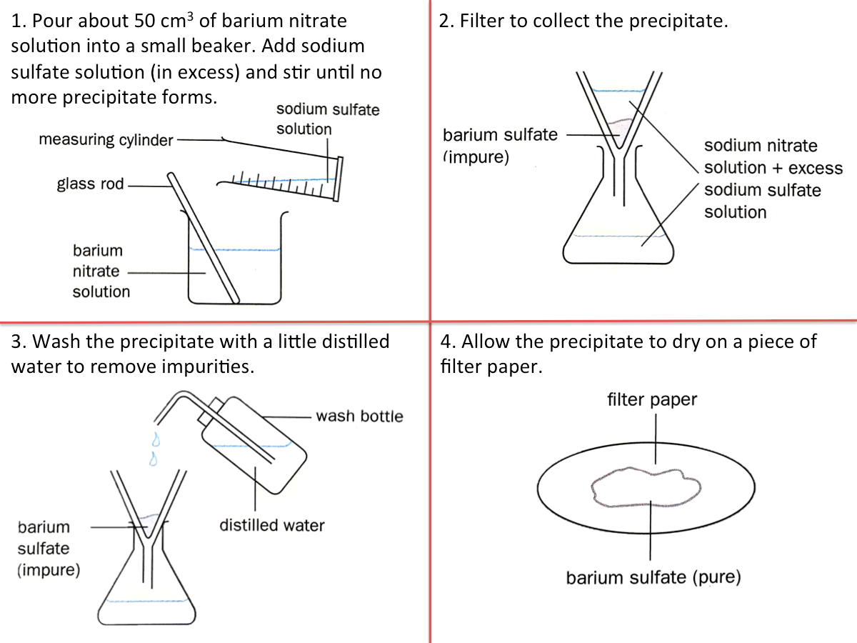 This method is used for preparing insoluble salts since the salts can be separated from the starting materials by filtration. The figure below shows how barium sulfate can be prepared by precipitation.