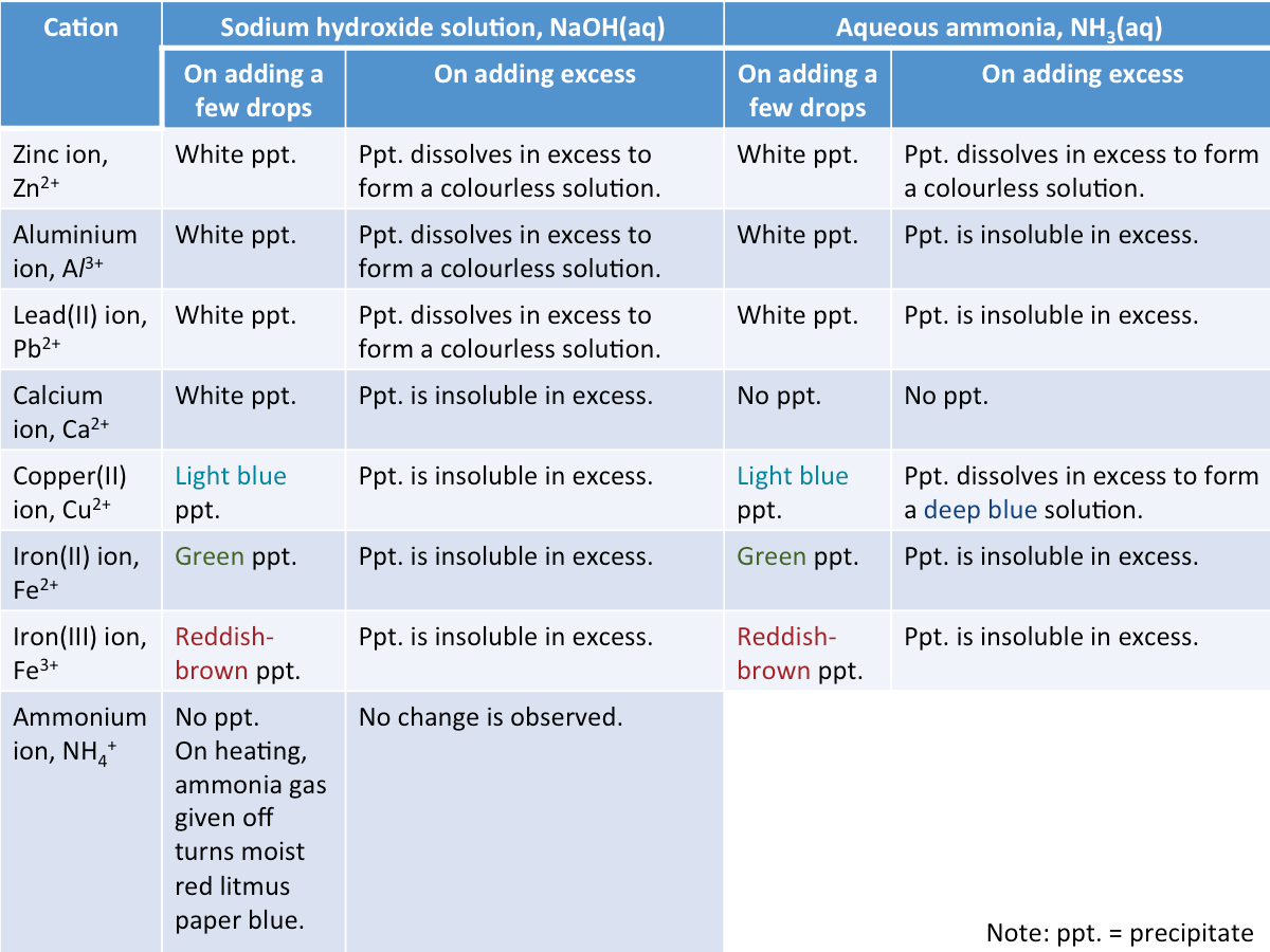 The table below summarises what would be observed when sodium hydroxide solution and aqueous ammonia are added to solutions containing different cations.