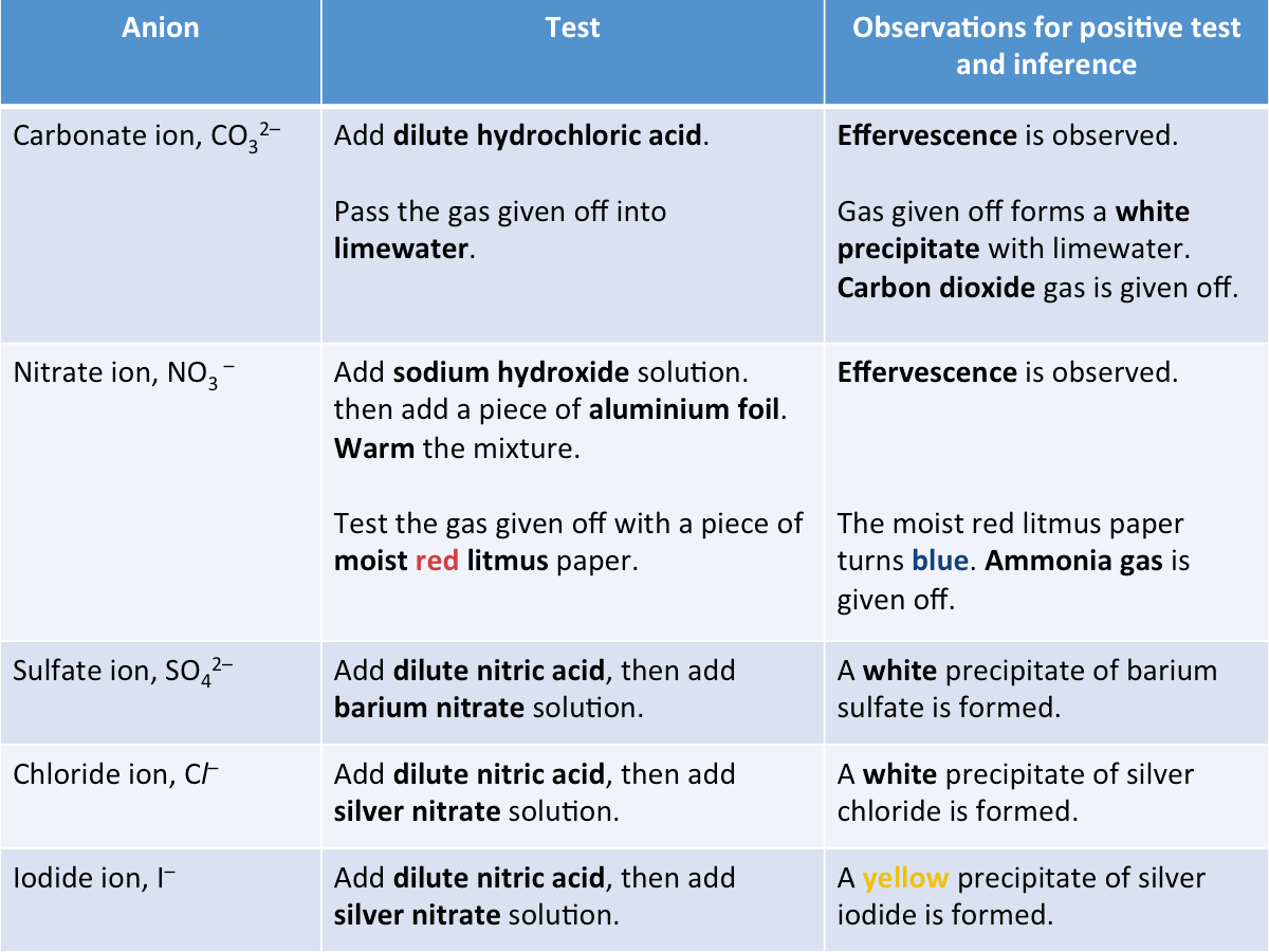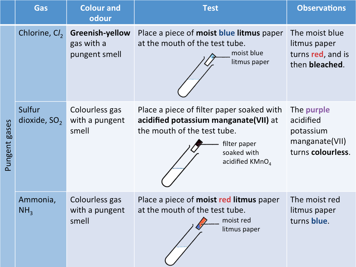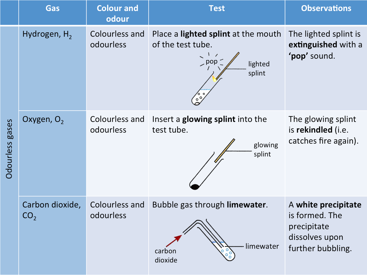 A gas is often liberated when an unknown salt is being tested. The table below shows the tests used to identify some common odourless gases.