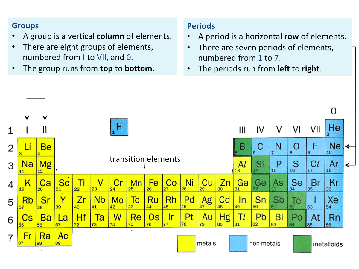 The periodic table is a list of elements arranged in order of increasing proton (atomic) numbers.