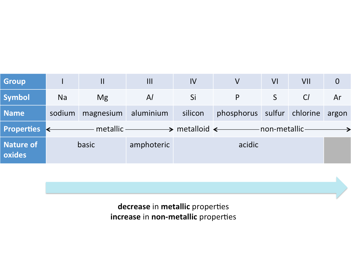 From left to right across the period, there is a decrease in metallic properties and an increase in non-metallic properties.