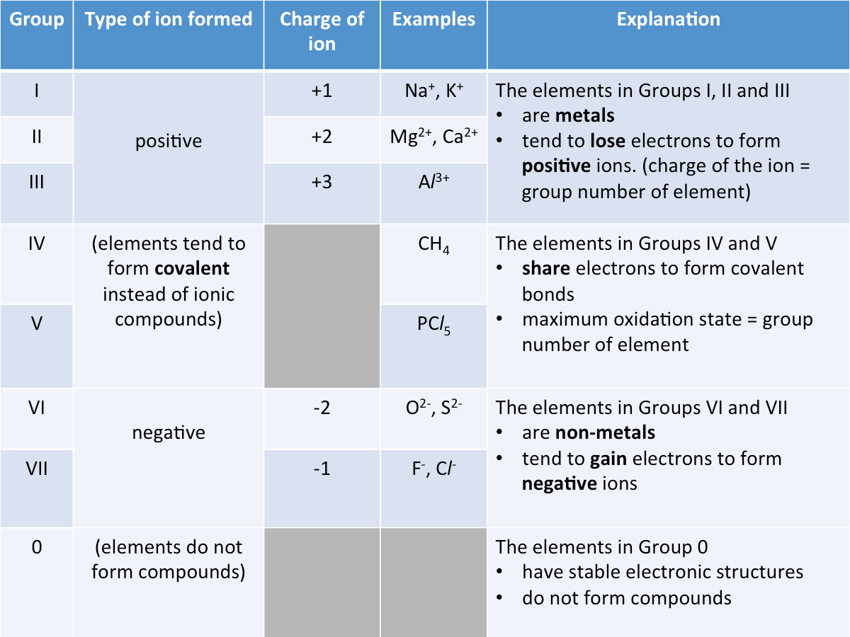 The table below shows the relationship between the group number and the charge of the ion formed by each element.