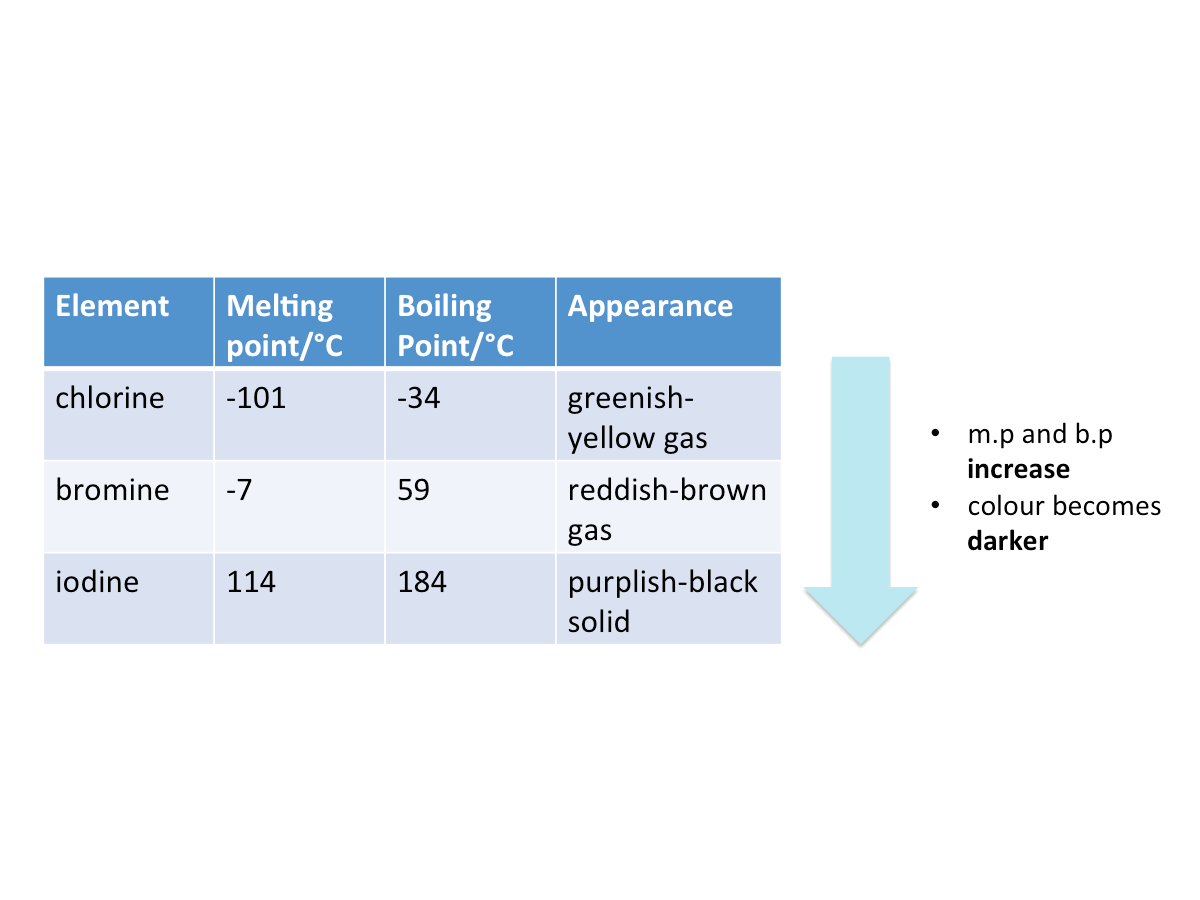 The order of reactivity of halogens can be deduced from thier displacement reactions. Unlike alkali metals, the reactivity of halogens decreases down the group, making it more difficult for the nucleus to attract one more electron.