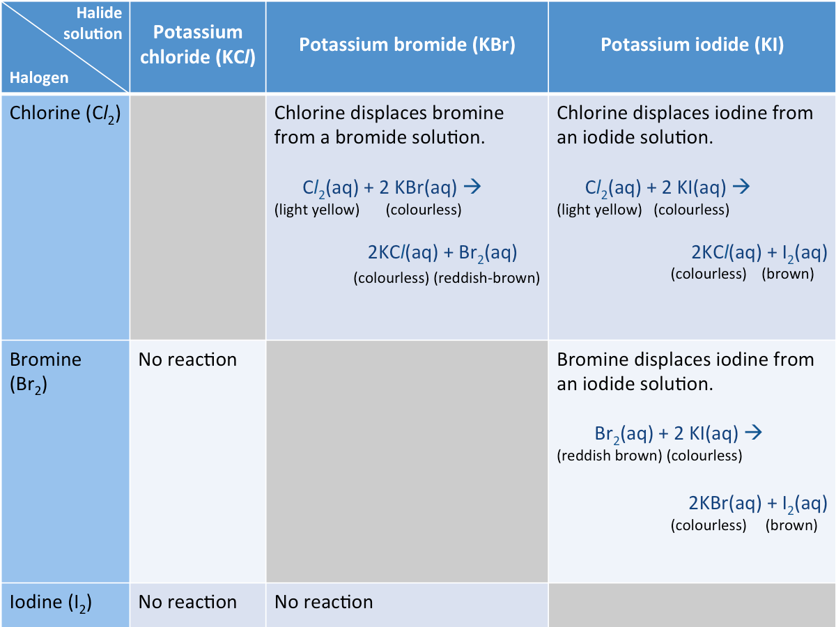 The displacement reactions of some halogens are shown in the table below. A less reactive halogen cannot displace a more reactive halogen form its halide solution.