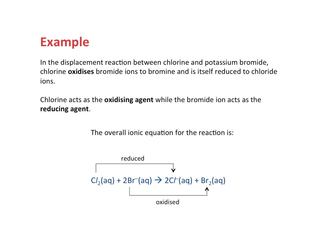 The displacement reactions between halogens and other halide ions can also be classifed as redox reactions. An example is shown below.