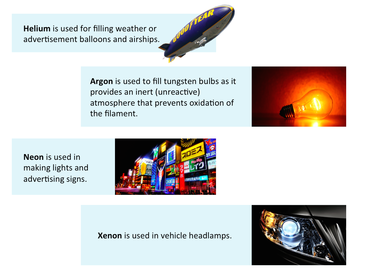 Noble gases are mostly used to provide an inert atmosphere. The figure below shows some applications of noble gases.