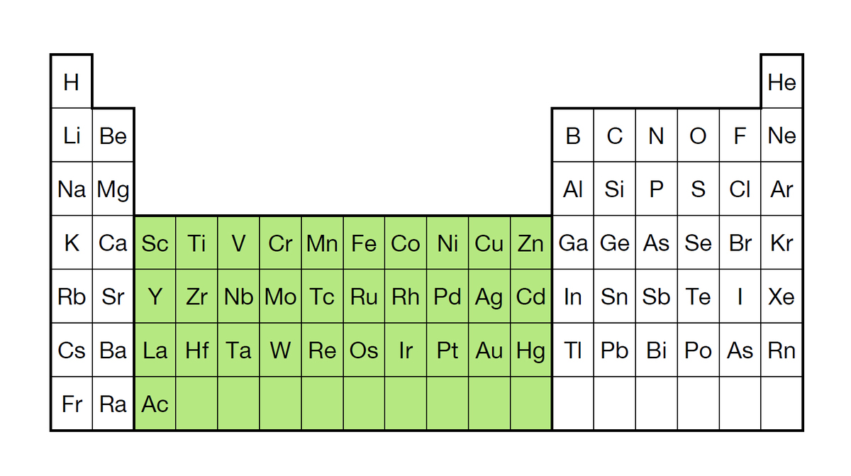 Transition elements or transition metals are the block of metals found between Groups II and III of the Periodic Table.