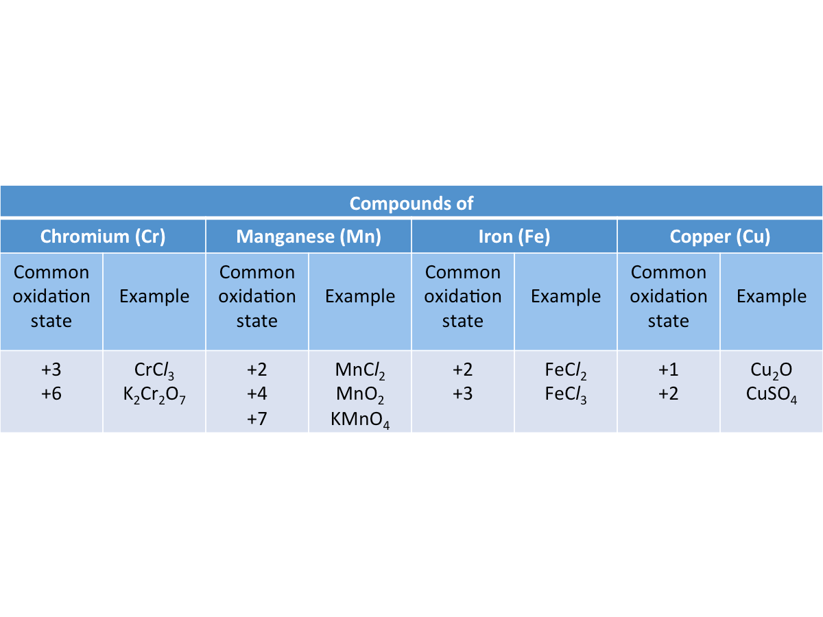 The table below shows the variable oxidation states of some transition metals in their compounds.