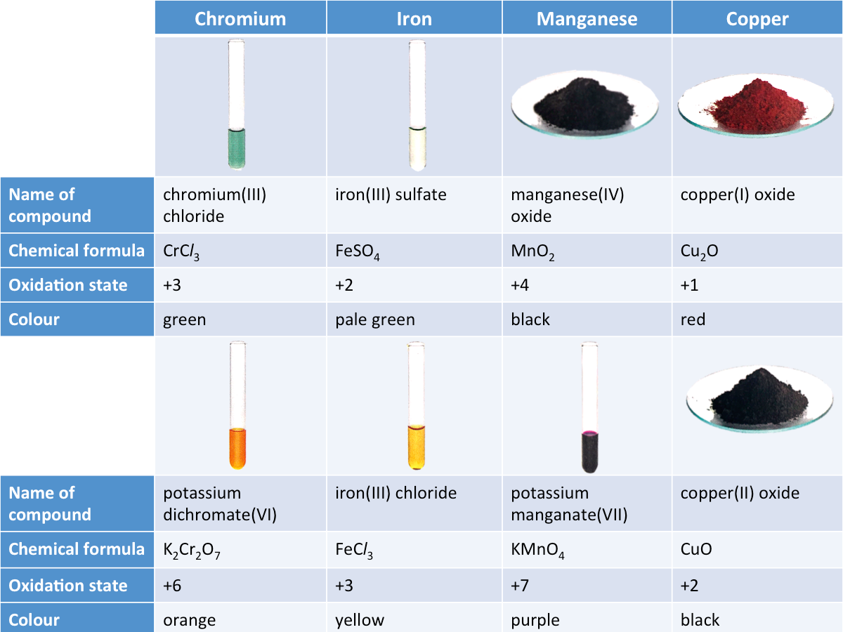 The table below shows the colours and oxidation states of some transition metal compounds.