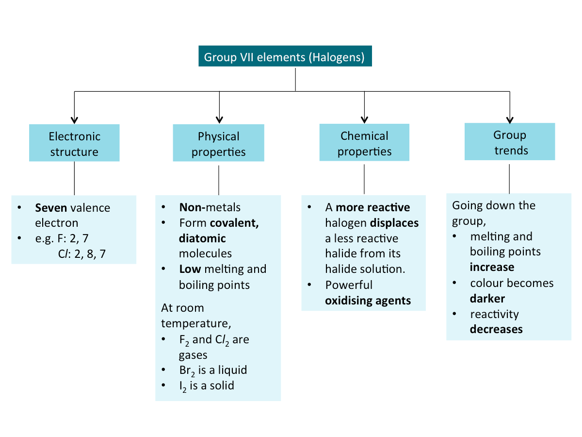 Halogens are non-metals that exist as diatomic covalent molecules (e.g. F2, Cl2, Br2)