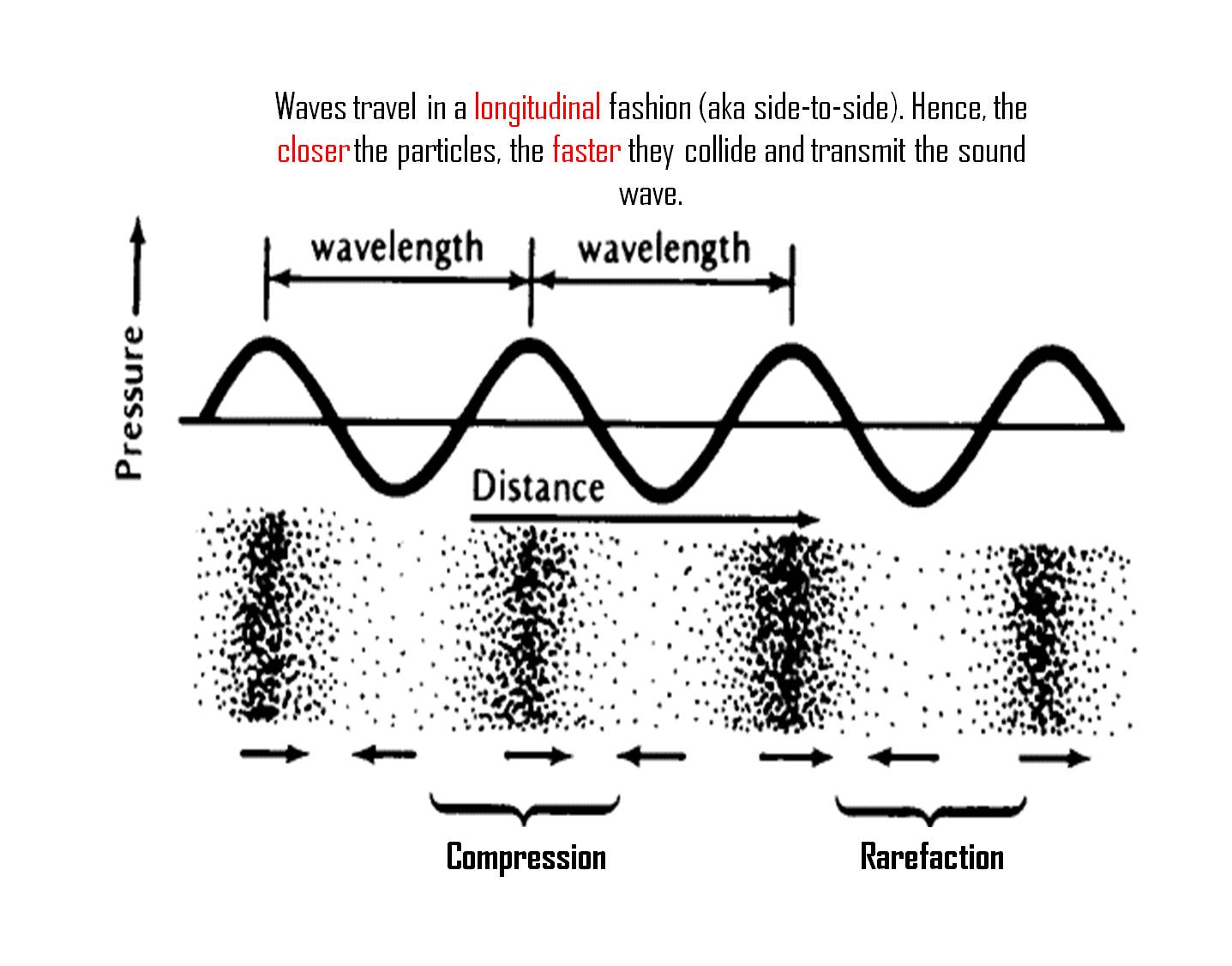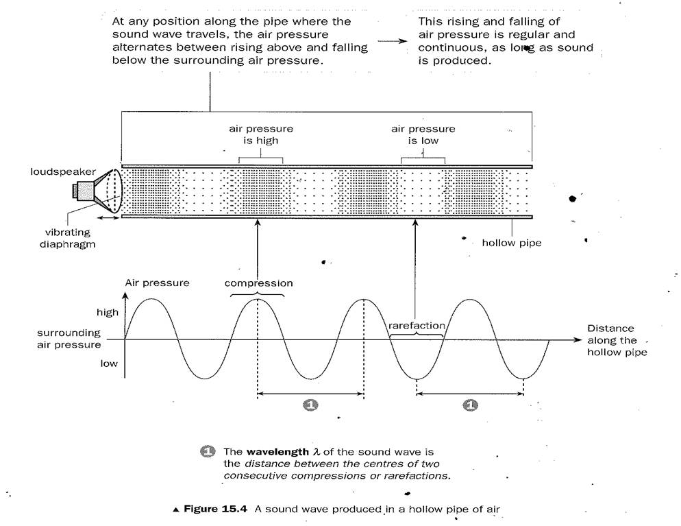 As sound waves are longitudinal waves, they propagate in a series of compressions and rarefactions. At regions of compressions, the air pressure is high. At regions of rarefactions, the air pressure is low. This can be represented in a Pressure-Distance Graph.