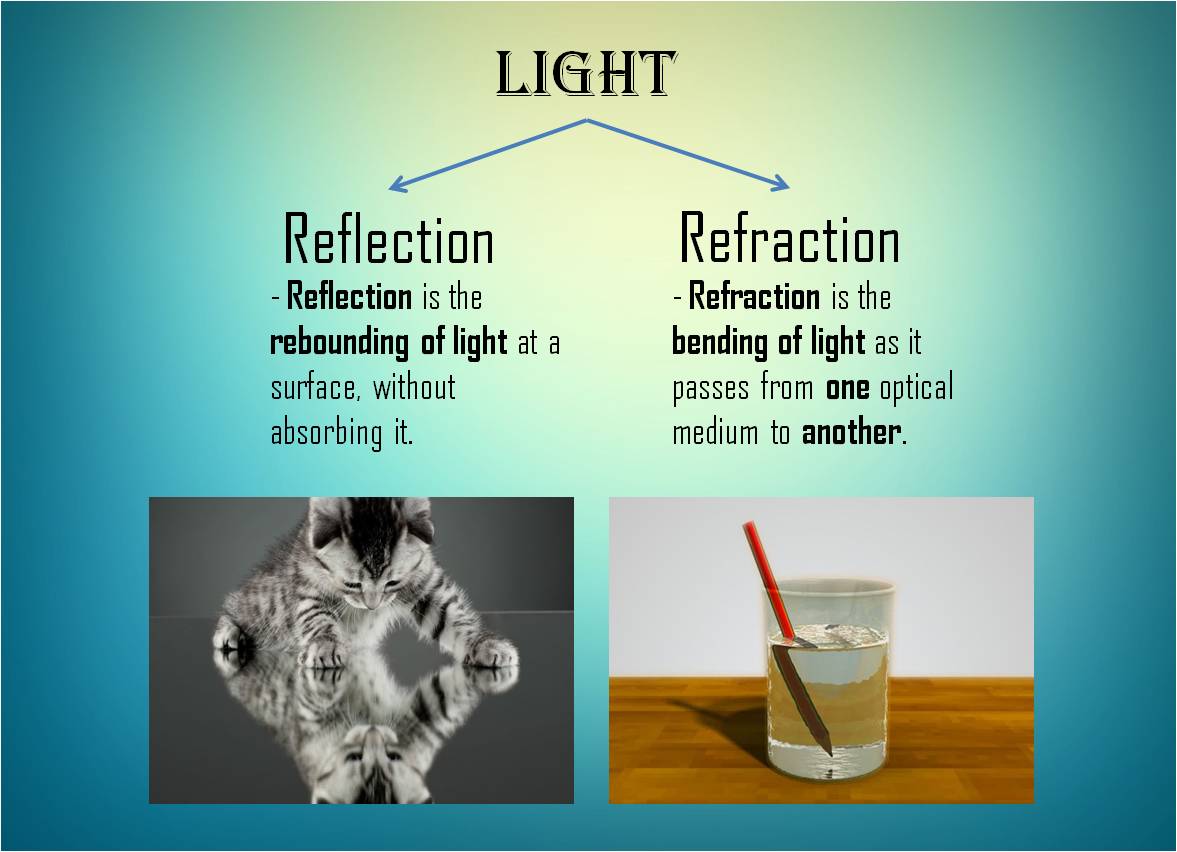 Reflection and refraction both refer to different things. Both describes the way light behaves when it approaches an object that is opaque, translucent or transparent. Look at the table below.