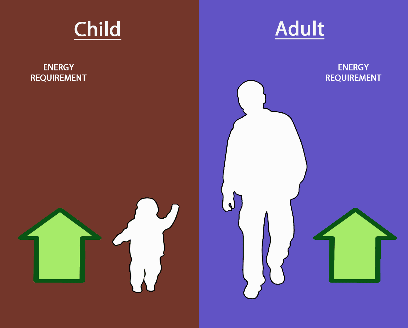 Humans tend to use more and more energy as we age, until we stop growing. However, children need a higher proportion of proteins than adults do.