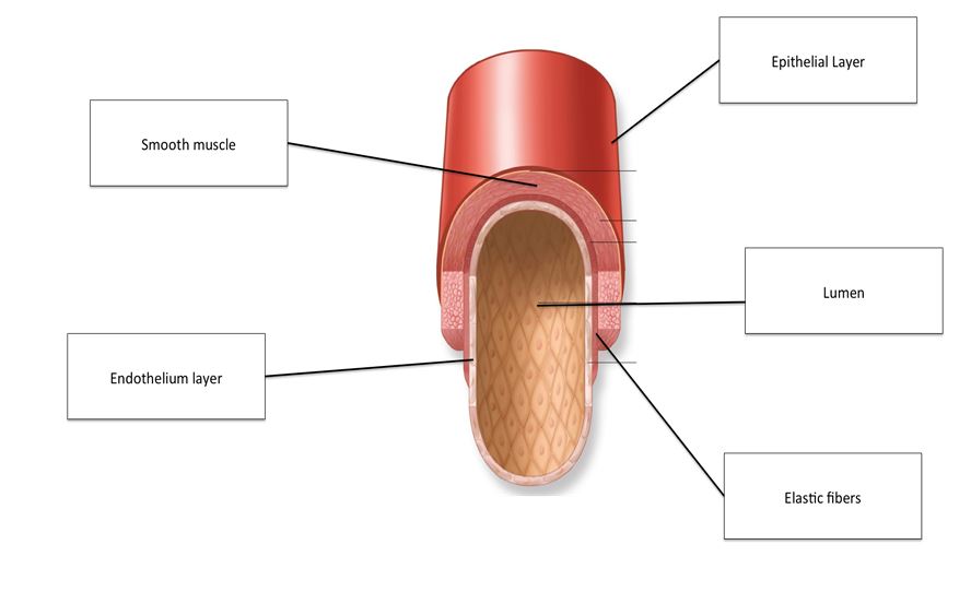 All three blood vessels have a single layer of endothelial cells (squamous epithelium). Arteries and veins have a tunica media (smooth muscle) and a tunica externa (elastin and collagen). Arteries have more elastin than veins in their tunica externa. Arteries have a relatively small lumen (space inside the vessel), and veins have a larger lumen. Capillaries have the smallest lumen.