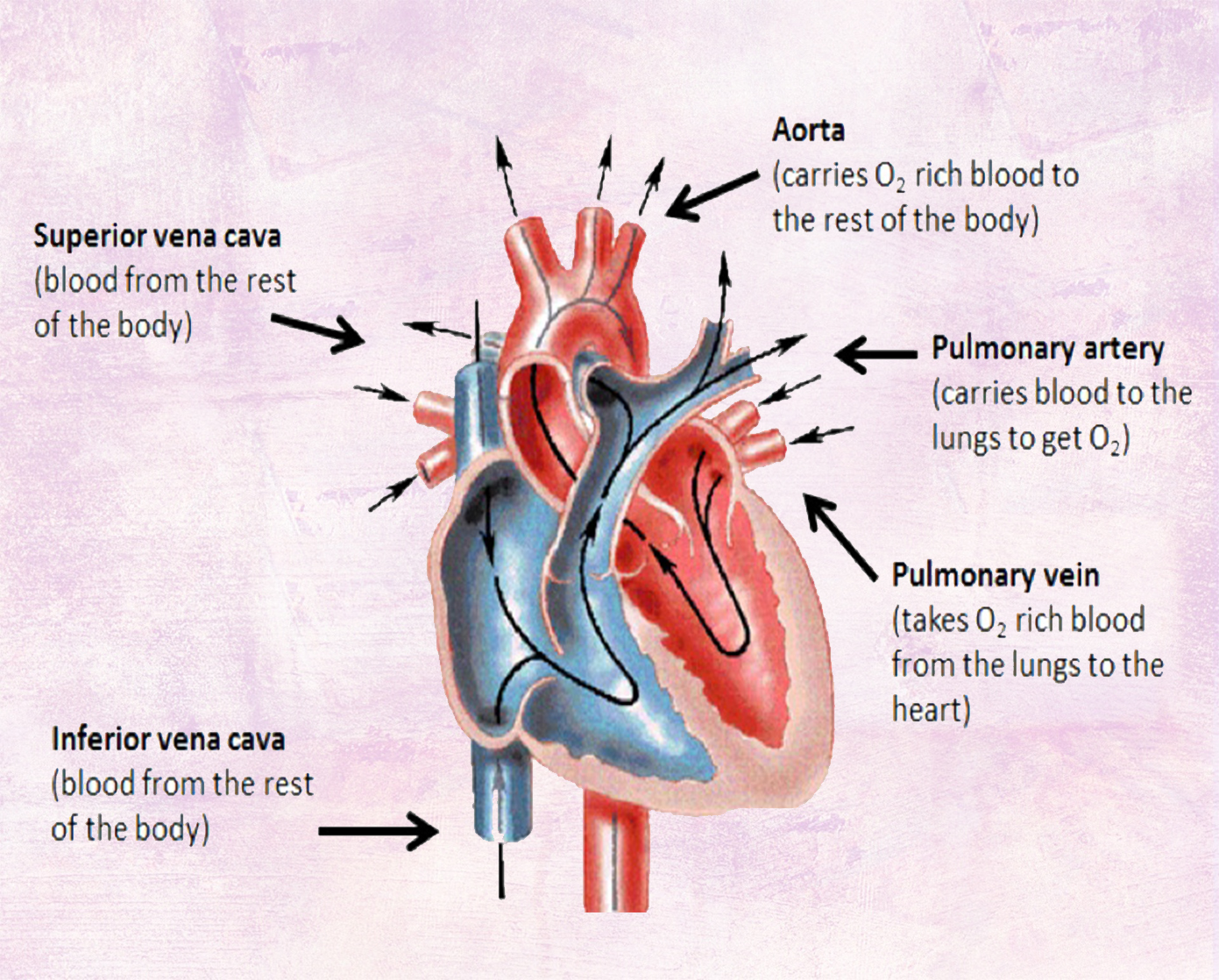 The heart and the systemic circulation are connected by the aorta and vena cava while the heart and the pulmonary circulation are connected by the pulmonary artery and pulmonary vein.