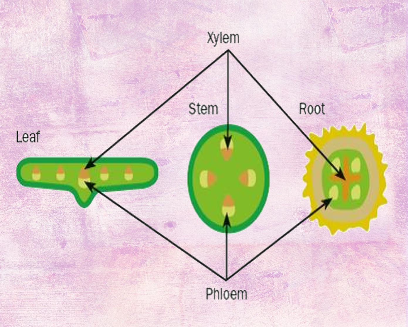 You are required to know the positions of xylem and phloem in leaf, stem as well as roots.
