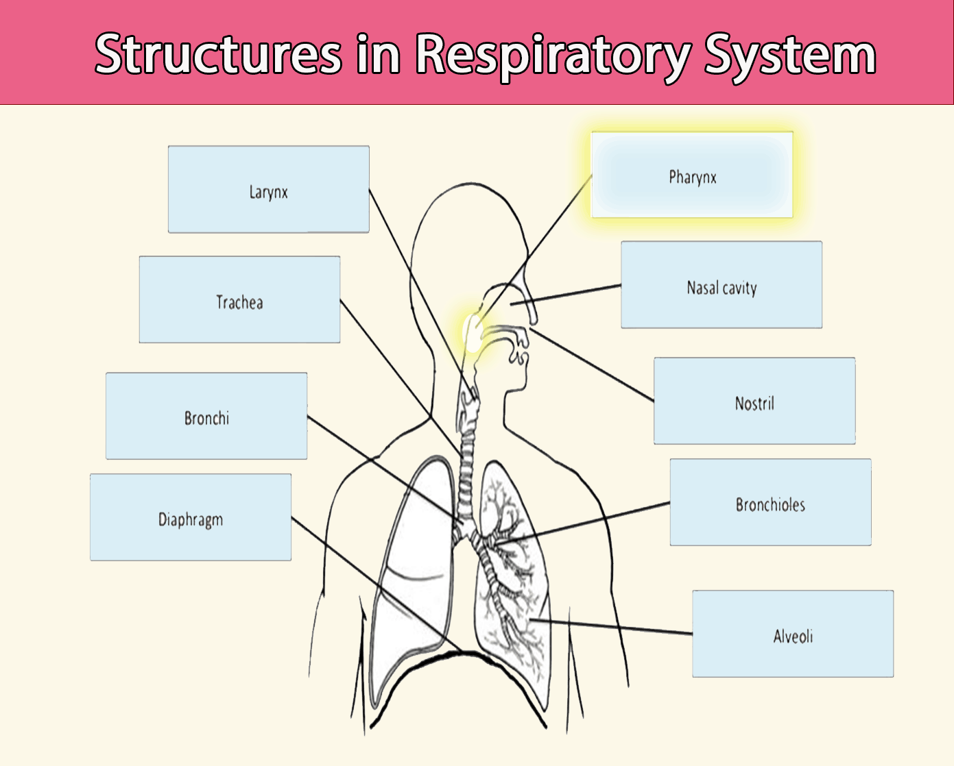 Name and identify the lungs, diaphragm, ribs, intercostal muscles, larynx, trachea, bronchi, bronchioles, alveoli and associated capillaries