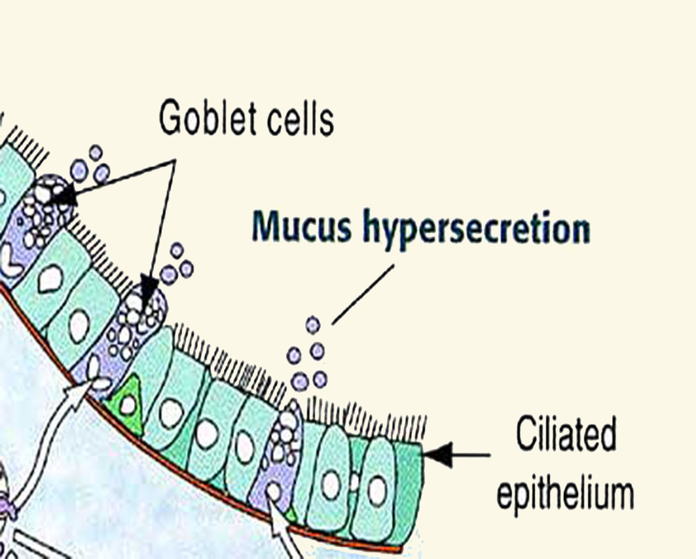 A thin layer of mucus lines your trachea, bronchus and bronchioles. It is a sticky substance produced by cells called goblet cells. This sticky substance traps dust particles, smoke particles and pathogens.