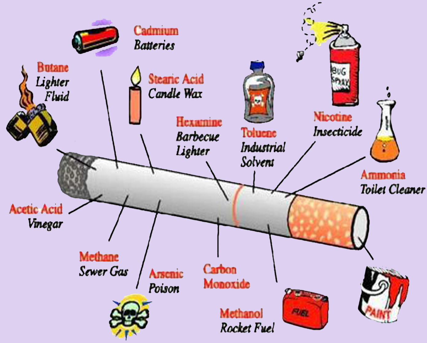 Of the thousands of chemicals present in tobacco smoke, important ones include tar, nicotine and carbon monoxide.